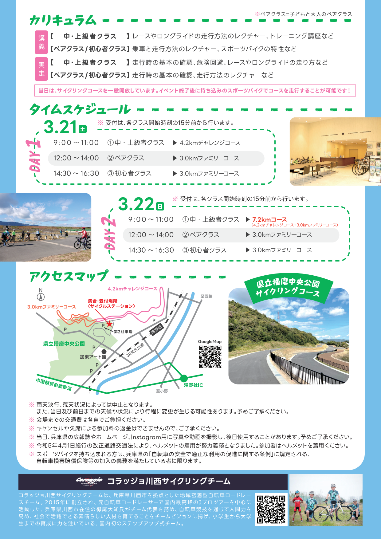 毎年Jプロツアーが開催される県立播磨中央公園のサイクリングコースで、元自転車ロードレーサーの栂尾大知氏(コラッジョ川西サイクリングチーム)による、本格的な指導が受けられるスポーツバイクの教室を開催します。