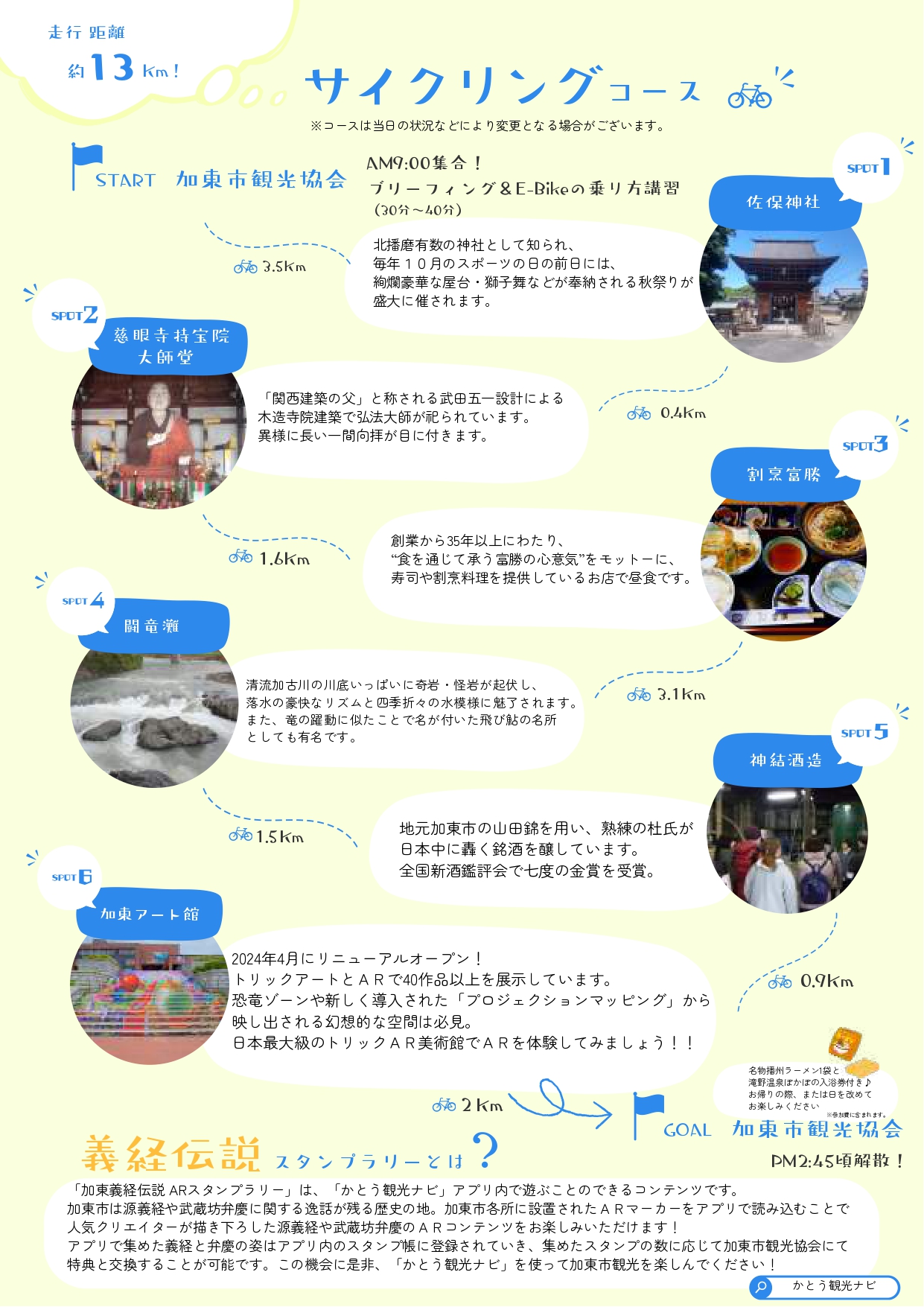 今回は加東市の各所をE-Bikeで巡りながら、関西万博に向けた兵庫県の取り組み「ひょうごフィールドパビリオン」のプログラムにも認定されているAR技術を活用したコンテンツもお楽しみいただけます!